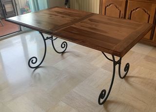 TABLE PLATEAU EN BOIS MASSIF ET PIEDS EN FER FORGÉ longueur 1,60 Largeur. 0,90 Hauteur. 0,77 En bon état
