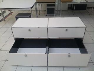 Vend un sideboard de couleur blanc et de marque usm haller de 4 cases dont celles du haut avec 2 portes abattantes en H 25cm et le bas avec 2 tiroirs coulissants équipés de paniers