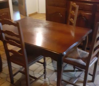 Table bois avec 2 rallonges et 6 chaises. Sans rallonges 126x 90 cm. Avec rallonges 214 x 90 cm. Bon état.