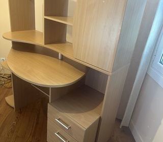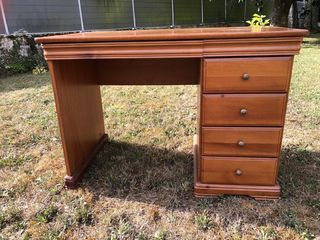 A vendre bureau en pin massif teinte merisier Hauteur 77cm, longueur109cm et largeur 59cm.