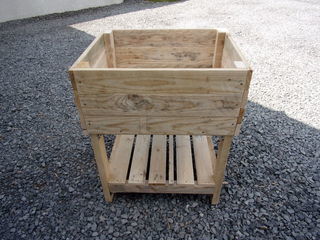 Potager surélevé en bois de palette avec étagère basse État neuf brut préparé Fond en pvc ép 30 mm Planches ép 20 mm Piétement chevrons de 70 x 40 mm Profondeur du bac 28 cm