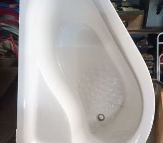 Baignoire d'angle 150x50 couleur beige avec robinetterie et évacuation. Prix 70€. A retirer sur place.