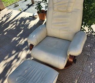 Fauteuil en cuir , bon état , la garniture en mousse a été refaite par un professionnel. Avec repose pieds.