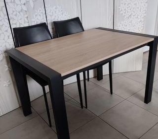 table à manger avec rallonges intégrées en bois clair et pieds métal noir, longueur 120cm, 160cm avec rallonge, largeur 80 cm