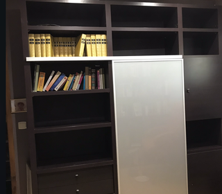 meuble en bois, sur roulettes composé sur la droite de 2 portes, 2 étagères et une niche, et sur la partie gauche de 3 étagères fermées par une porte vitrée. Dimensions : L: 138c