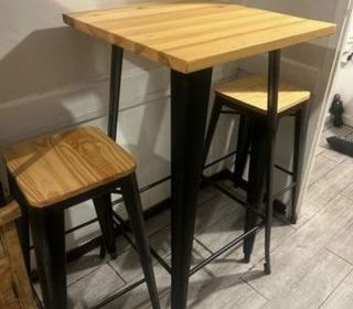 Vends ensemble suivant: Table haute Bois de Pin et Acier LIX de Sklum Dimensions: 60/60/104 cm Les deux tabourets assortis LIX 30/30/75 Très bon état À venir chercher