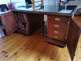 Rare authentique Bureau Officier de Marine - Capitainerie Symétrique pour travail de 2 personnes face à face avec 2 Caissons - Bois exotique + Vitre de protection sur le plateau.