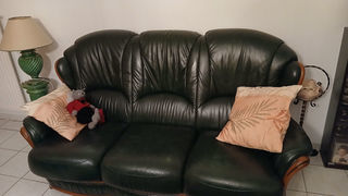 Salon composé de 2 fauteuils et d'un canapé 3 places en cuir de couleur vert foncé et bois massif, en bonne etat.