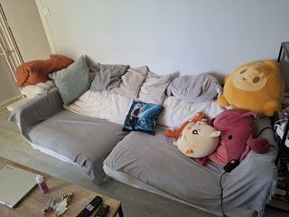 Canapé clic-clac IKEA couleur gris foncé en très bon état, propre et bien entretenu. Une petite tache sur l'avant du canapé mais qui ne se voit pas à l'?il nu. Se transforme fac