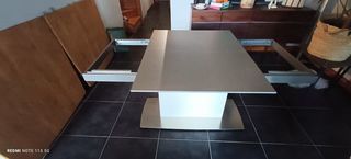 belle table de Salle à manger jusqu'à 10 personnes. Composée de 2 plateaux de 90x90cm en sapin teintés chêne clair,la table s'ouvre sur une rallonge qui porte sa longeur totale a