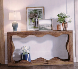 Console longue et fine, avec ouverture centrale sculptée comme une vague. Le bois clair et texturé donne un rendu doux, parfait pour mettre en valeur un vase, une lampe ou une ?uvr