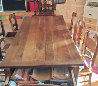 magnifique table en merisier avec ses 3 tiroirs qui prennent toute la surface. dimensions : 224 longeur 85,5 largeur 56,5 hauteur vendue avec ses 8 chaises en paille en parfait