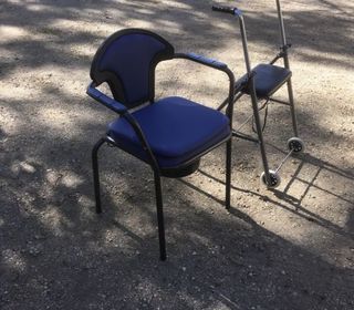 lot un fauteuil avec pot , WC sous assise amovible . Armature métallique époxy gris bois jusqu?à 120 kg avec accoudoir dossier revêtu simili cuir plastifié coloris bleu. Un déambul