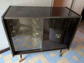 Meuble vitrine sur roulette 1 partie vitrée avec 2 étagères, intérieur capitonné 1 partie fermée avec emplacement bouteilles Noir laqué, bel aspect Lampe intégrée (1 fonctionn