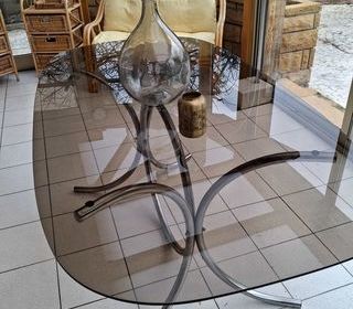 Table plateau en verre fumé 180x098 - piètement en métal chromé Dimensions : 180 x 98 cm Bon état