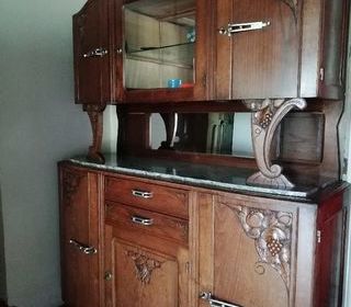 meuble ancien en deux parties avec plaque de marbre , miroir et vitrine hauteur : 195 cm largeur:160 cm profondeur : 50 cm