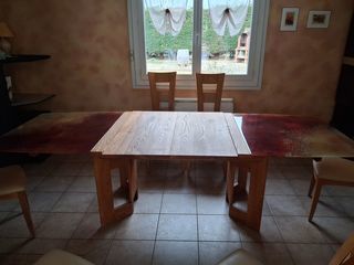 Vends belle table de salle à manger au design original avec plateau en verre fusion (aspect texturé et coloré unique), accompagnée de 6 chaises assorties en hêtre massif. ? Table
