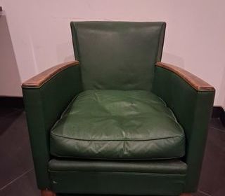 2 Fauteuils anciens en bois et cuir vert Géométrie type fauteuil Club Espace compact hauteur 68 cms, largeur 67 cms et profondeur 67 cms 1 paire : 1 fauteuil vendu et 1 donné
