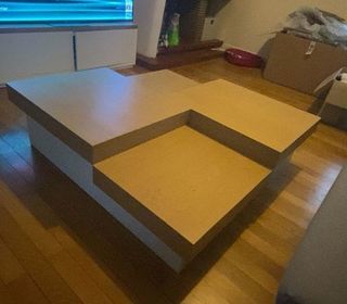 Vend table basse carrée de salon Austral , couleur chêne clair et blanc satiné . ( légèrement abîmée sur un côté) Dimensions 121cm × 121cm .