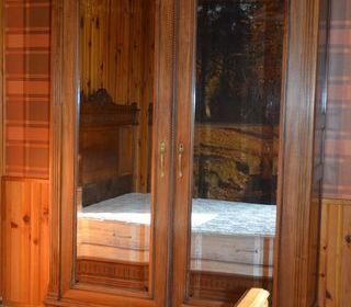 Très belle armoire ancienne en noyer massif finement sculptée. Entièrement démontable. Composée de 2 portes miroir et d'un grand tiroir. Aménagée d'étagères, d'une penderie et d