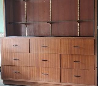 Grand meuble de 9 tiroirs et 2 étagères Ancien meuble d'usine ouvert derrière (installer au dessus de gros tuyaux) Hauteur=2,10m Longueur=1,95m Profondeur=52cm Du sol jusqu'