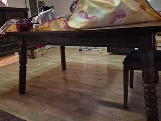 belle table de Salle à manger jusqu'à 10 personnes. Composée de 2 plateaux de 90x90cm en sapin teintés chêne clair,la table s'ouvre sur une rallonge qui porte sa longeur totale a