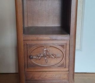 Petit meuble haut pouvant servir de meuble d'appoint ou de table de nuit Dessus en marbre 1 tiroir, 1 espace vide, 1 placard Hauteur=86cm Largeur=42cm Profondeur=40cm 1er