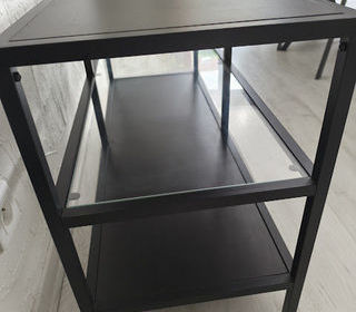Meuble TV, étagère vitrée , dessus bois marron foncé, pieds et structure métal, longueur 1 m, hauteur 53 cm, hauteur entre l'étagère 18 cm, largeur 36 cm, excellent état A venir