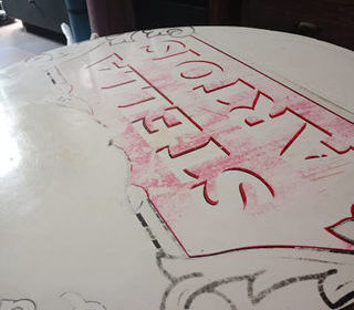 Table touret, diamètre 77 cm, hauteur 45 cm, avec revêtement décoratif Stella Artois De la cire de bougie sur le socle que l'on peut enlever facilement ( voir photo) Le prix est