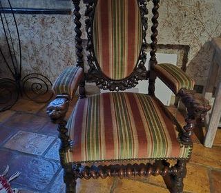Chaise ancienne richement sculptée en bois foncé, avec une assise et un dossier rembourrés revêtus d'un tissu rayé multicolore. La chaise présente des ornements détaillés sur toute