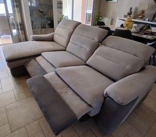 Canapé 3/4 places en tissu gris avec chaise longue. Doté de plusieurs places assises dont 2 à relaxation électrique ce canapé présente un dossier rembourré et des accoudoirs pour u