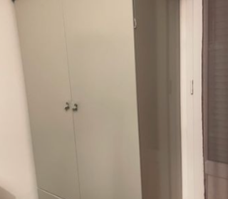 Placard à 2 portes battantes, un tiroir, une penderie et 4 étagères. Poignées étoiles. Dimensions : 180 cm x 96 cm x 55 cm (profondeur).