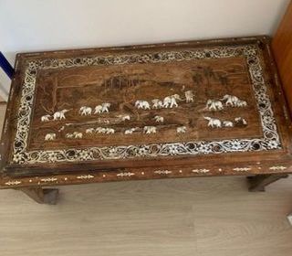 Vends belle table indienne bois exotique massif , motifs en nacre, pieds galbés ( à resserrer ) mesures de la table : longueur : 1m04, H : 42 cm, profondeur : 56 cm importée d'Inde
