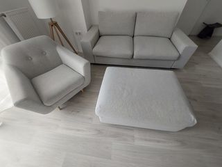 Ensemble canapé avec accoudoirs larges 2 places convertible, fauteuil et repose-pied avec rangement - Gamme VIMLE, Gunnared beige de chez Ikéa, en excellent état. Les housses sont