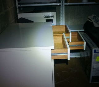 Meuble bas 3 tiroirs/2placards. Longueur : 86 cm Hauteur : 85 cm Profondeur : 61 cm Je ne connais pas le matériau (acier, formica, autres) mais le meuble est très lourd. A ven