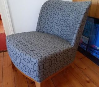 paire de fauteuils identiques, recouverts tissu gris clair à motifs géometriques gris foncés. Pieds bois. taille / hauteur 73, largeur 60, profondeur 69. De face ou de profil e