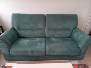 Canapé fixe 3 places, tissu microfibre, vert sapin. Structure bois massif, pieds bois, surpiqûres sur coussins et accoudoirs. Coussins déhoussables par zip. Coussins fixés au dos