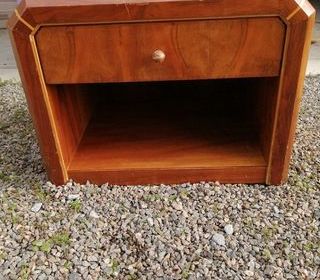 Table de chevet, bout de canapé des années 30-50. Je pense qu'elle est en noyer blond mais je ne suis pas sûre. Il y a un grand tiroir et une grande niche en dessous. Hauteur: 4