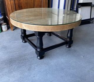Vends table basse ronde en bois relooké Pieds noirs et plateau bois épais Table basse assez lourde Plateau en verre sur le dessus s'enlève Pas d'envoi ni de paiement en