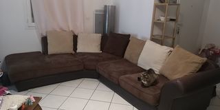Canapé d'angle non convertible et non réversible longueur 285 cm. Assise très confortable, entièrement dehousable et lavable. Accoudoirs en cuir et canapé en daim. Quelque griffu