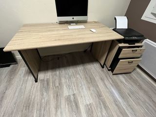Bureau plaqué chêne clair et meuble servante pour imprimante deux tiroirs parfait état Dimensions : 140 x 80 plateau de 25 mm