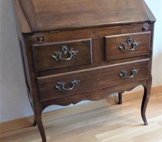 En noyer massif, joli petit secrétaire dos d'âne à pan coupé et à tirettes sur pieds galbés L'écritoire repose ouvert sur deux tirettes escamotables qui en assurent sa solidité A