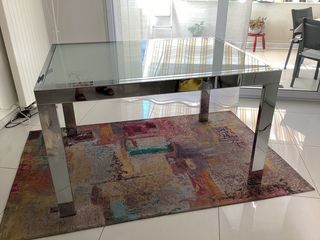 Table extensible 10 personnes Structure chromée, plateaux en verre sablé Dimensions: 90 x 120 H 74 ouverte: 90 x 240