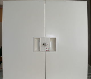 Armoire à pharmacie murale en plastique blanc. - Dimensions : Hauteur 54,5 cm - Largeur 53 cm - Profondeur 20 cm - Traces de jaunissement mais en bon état - Clé pour verrouiller