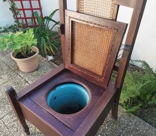 Chaise percée en bois avec détails en cannage intact. Cette chaise ancienne présente un cannage sur le dossier et un encadrement amovible, révélant un pot émaillé bleu encastré. Id