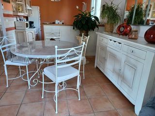 A vendre sable à manger complète, en chaine massif, composée d'une table ronde (avec rallonge de 45cm), diamètre de la table 130 cm (sans rallonge), hauteur 75 cm. Les 4 chaises,