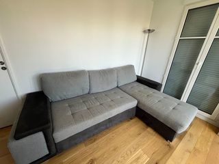 Canapé d'angle côté droit convertible lit avec un coffre intégré et un pouff. Le canapé est en tissus gris noir. Légèrement taché Prix négociable