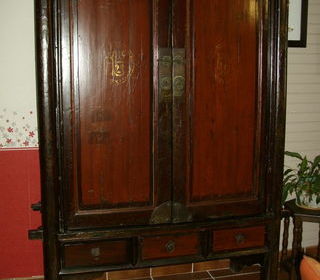 Meuble Chinois "appelé" de mariage, décoration dur les portes et meuble en deux couleurs rouge et noir, idéal pour une salle à manger, nombreuses étagères + 3 tiroirs. Longueur 1,3
