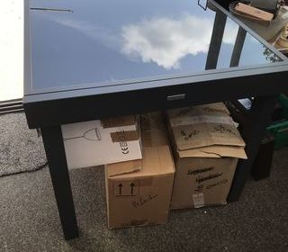Cause déménagement en appartement, vend table de jardin 90x90 cm. Avec allonge => 180à-90 cm Plateau verre. 4 chaises en textylène pliables grises assorties. Etat neuf. A ven