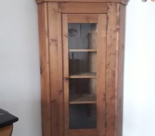 Armoire vitrine d'angle en bois. Le meuble est en bois massif avec une finition naturelle, et comprend des étagères à l'intérieur, visible à travers la porte vitrée. Idéal pour ran